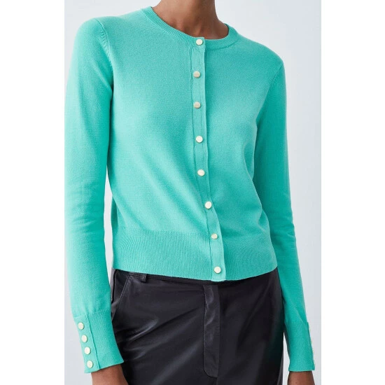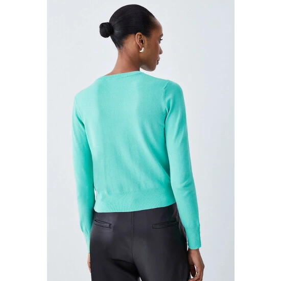 70% Responsibly Sourced Viscose. 30% Nylon. Wash as wool. Model wears petite XS