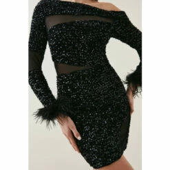Discount 🎉 KarenMillen Tall Sequin Velvet Mesh Detail Feather Cuff Jersey Mini Dres For Female 🤩