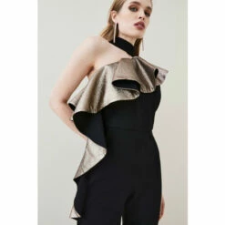 Flash Sale โค๏ธ KarenMillen Gold Jacquard Ruffle Structured Crepe Jumpsuit For Female ๐ฏ